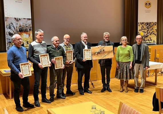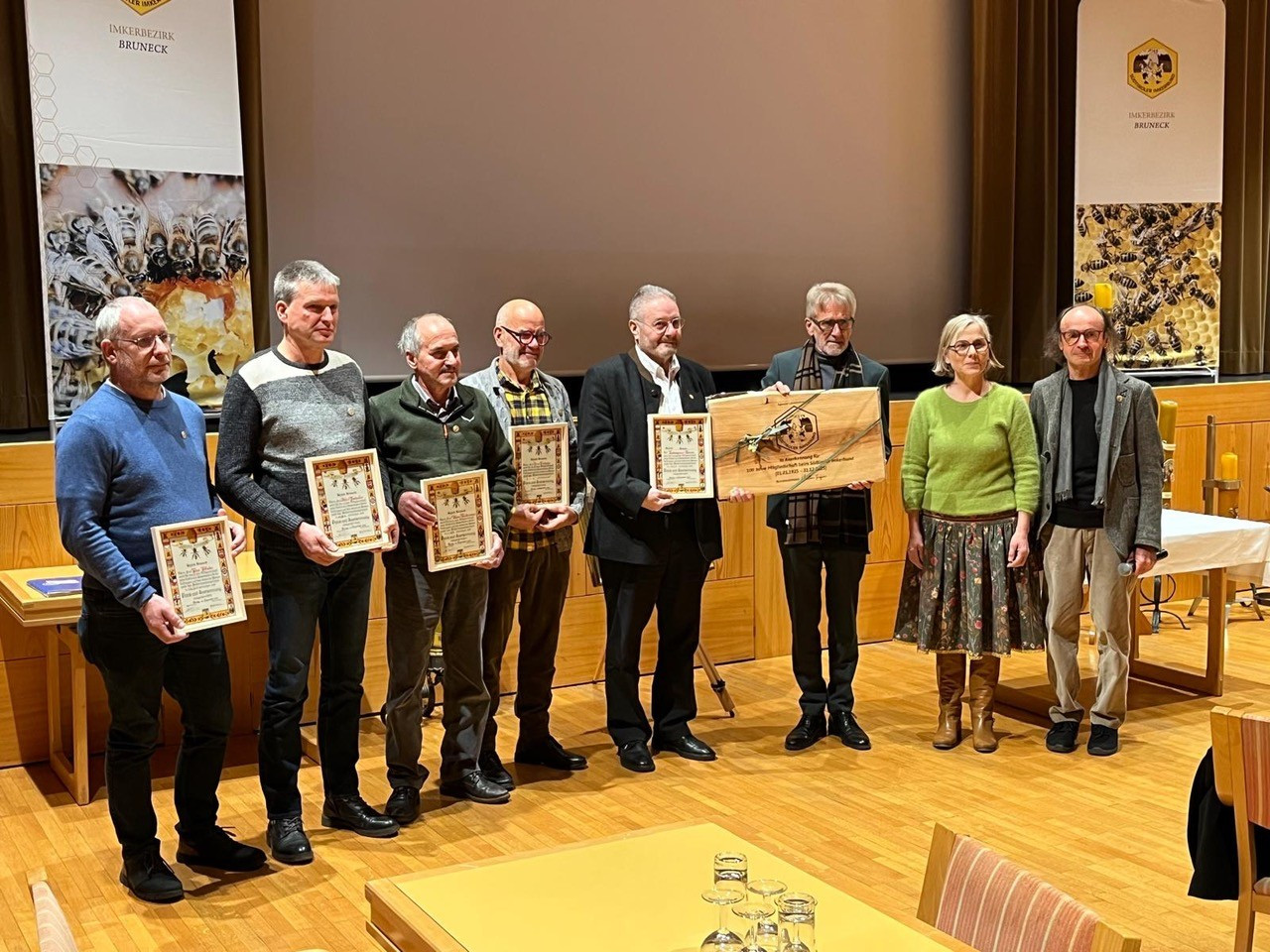 Ein besonderer Moment in der Veranstaltung waren die Ehrungen für langjährige Mitgliedschaft im Südtiroler Imkerbund. Die Fachschule Dietenheim für Land- und Hauswirtschaft und Ernährung erhielt für das 100-jährige Bestehen des Landesbienenstandes in Dietenheim eine besondere Auszeichnung. Albert Wurzer, Direktor der Agentur Landesdomäne, nahm die Ehrung entgegen. In seiner Ansprache gab er einen Überblick über die Entstehung des Landesbienenstandes, der bis heute in erster Linie für die Pustertaler Imker als Anlaufstelle dient.